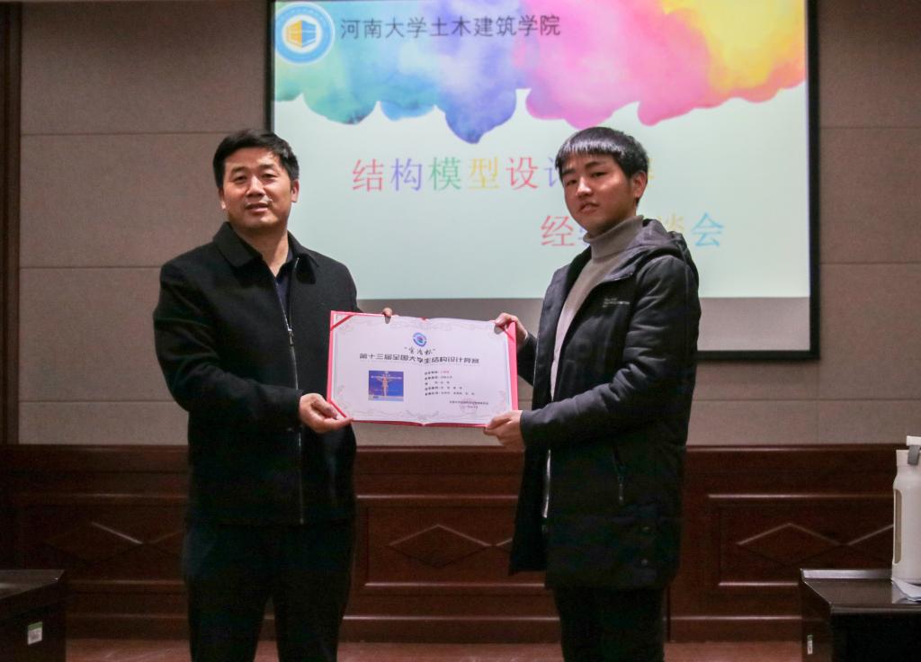 主持人介绍了出席座谈会的人员、座谈会的主要内容后,由院长给在构件设计比赛中取得优异成绩的同学颁奖。16级的王兵兵、郑万州、章志伟学长给大家分享比赛方法和经验,为大家提供了一个开阔的视野。针对模型制作的创新问题,学长们给到场的18级和19级土木工程专业的学生讲述了自己的宝贵经验并提出了建议:一是要具备“利用材料特性”的发散思维,去分析比赛材料的性质,解决模型构造的问题;二是要具备“利用制作工艺”的发散思维,从工艺上优化结构模型;三是要具备“利用清除扭转”的发散思维,从模型构件上下手,充分利用各个构件的特点,从而达到减轻自重的目的。院长岳建伟教授表示大学生要敢于动手,积极参加各种竞赛,展现青春风采。在制作模型时必定会遇到困难,这时要有勇于客服困难的决心和信心。赫中营老师详细的解释了作为土木工程专业的学生结构模型的比赛的重要性及参加构件比赛对个人今后就业的意义。边汉亮老师认为参赛者遇到问题时要学会及时向他人请教,不断完善自己的模型。最后由17级刘宏伟通过视频和讲述的方式给同学们介绍国赛的情况及参赛感想。