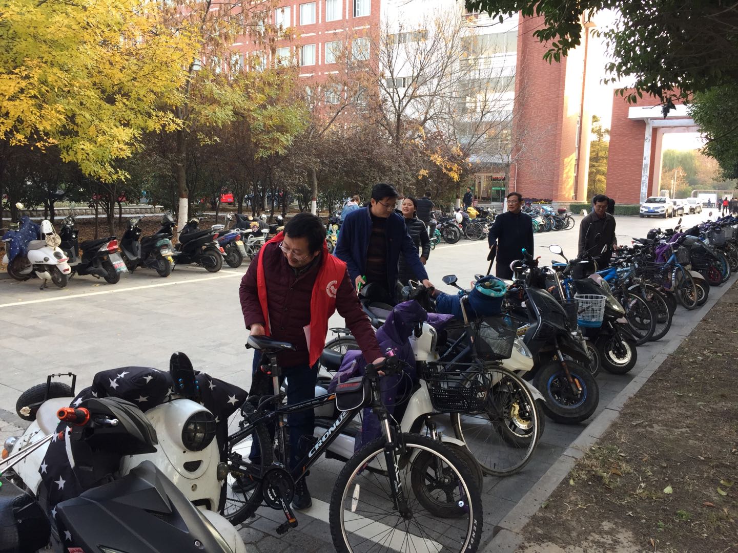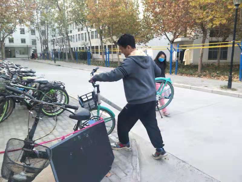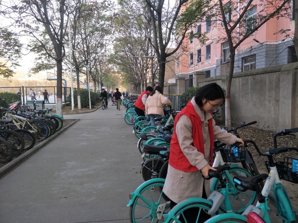 宿舍楼前、操场四周停放着大量自行车与电动车,不但占用了人行道、影响交通,而且也影响了校园的美观。党员志愿者们仔细将停放无序的车辆扶正摆齐,认真耐心劝导不文明停车行为的同时提醒大家爱护公共设施。寒风虽凛冽,干劲却十足。在一个多小时的辛勤劳动下,车辆被摆得整整齐齐,道路也更显开阔。