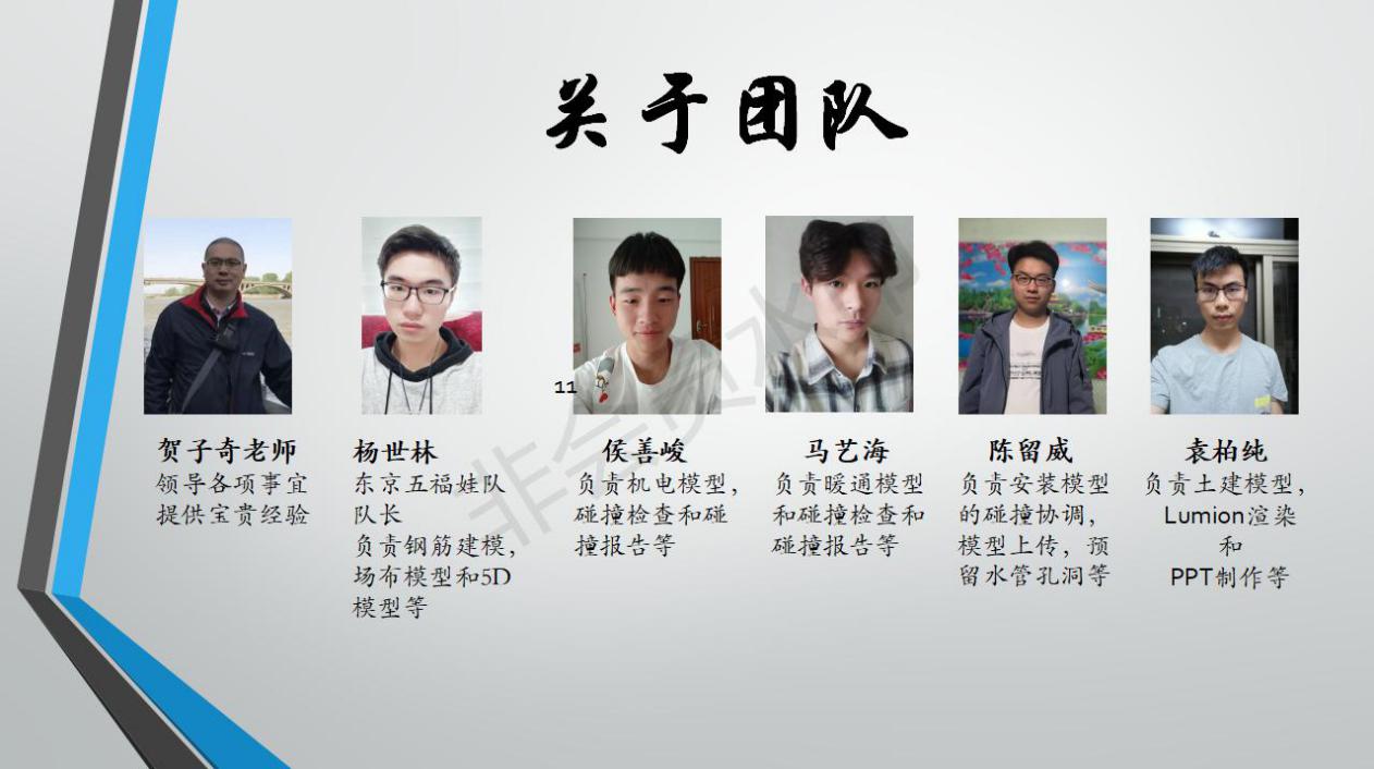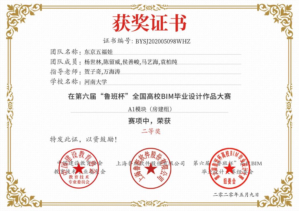 “东京五福娃”队参与的“鲁班杯”全国高校BIM毕业设计作品大赛于2019年10月1日正式启动报名,于2020年6月结束。大赛包含BIM建模,专项BIM应用,全过程BIM应用,室内BIM应用,BIM创新应用五个模块。历经八个月的全力备战,参赛团队按时提交了参赛成果(包含完整Revit模型、结合计价软件5D进度计划模型,完整的碰撞孔洞净高检查报告,多路径的模型内漫游检查视频,多阶段的场布模型等)。最终,经大赛赛务组和评审专家考评,由贺子奇,万海涛老师指导,学生杨世林,袁柏纯,陈留威,候善峻,马艺海组成的“东京五福娃”团队在A1房建模块和B1专项BIM应用中分别荣获二等奖和三等奖。