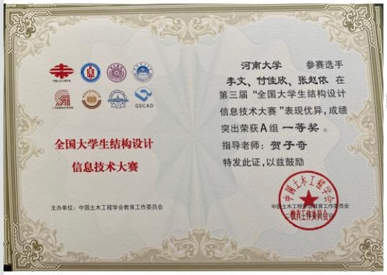 共有四个团队参加大赛,通过6个月坚持不懈的拼搏努力和团队配合,高质量地完成了BIM结构设计的全过程并提交作品,最终在全国高校891份有效作品中脱颖而出。由贺子奇老师指导的3个团队,分别为李文、付佳欣、张赵依组成的“建筑强心脏”队荣获一等奖,王欣飞、郝梦祥、邵佳奇组成的”BIMboys”队荣获三等奖,由麻赟东、宋涛、辛义文组成的“星星小队”荣获三等奖;由杜文风老师指导的1个团队,董尚斌、韩闯、岳浩组成的“嵩岳“队荣获二等奖。