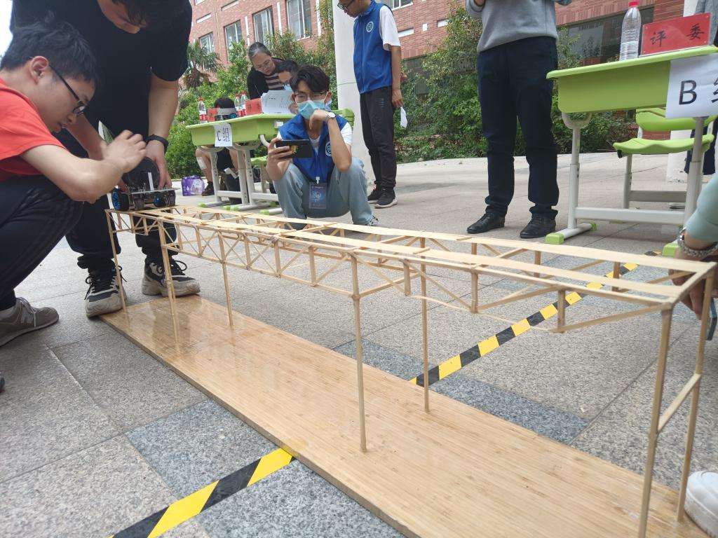 历时一个多月时间完成了结构模型设计阶段、结构模型预赛阶段,最终完成了竞赛。在结构模型设计阶段,主要进行结构选型,分析赛题,专业知识运用,设定结构设计方案,并进行力学计算。结构模型预赛阶段,各队探索和把握竹皮构成杆件截面形式和尺寸,以及杆件的连接方式。结构模型预赛中,在移动荷载加载(电动小车负重4公斤)和静力荷载加载(10公斤)中,检验了各个模型结构设计的合理性和制作质量。