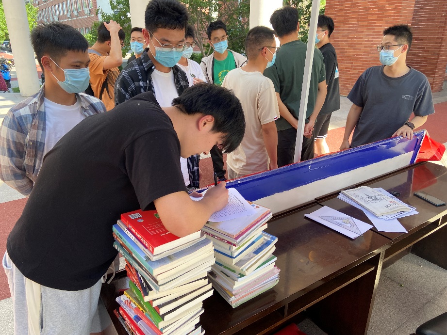 在圆形广场下,前来捐书的同学们依次排队等候登记信息。捐献后认真讨论相关图书的内容和彼此阅读后的感受。现场井然有序,氛围良好。