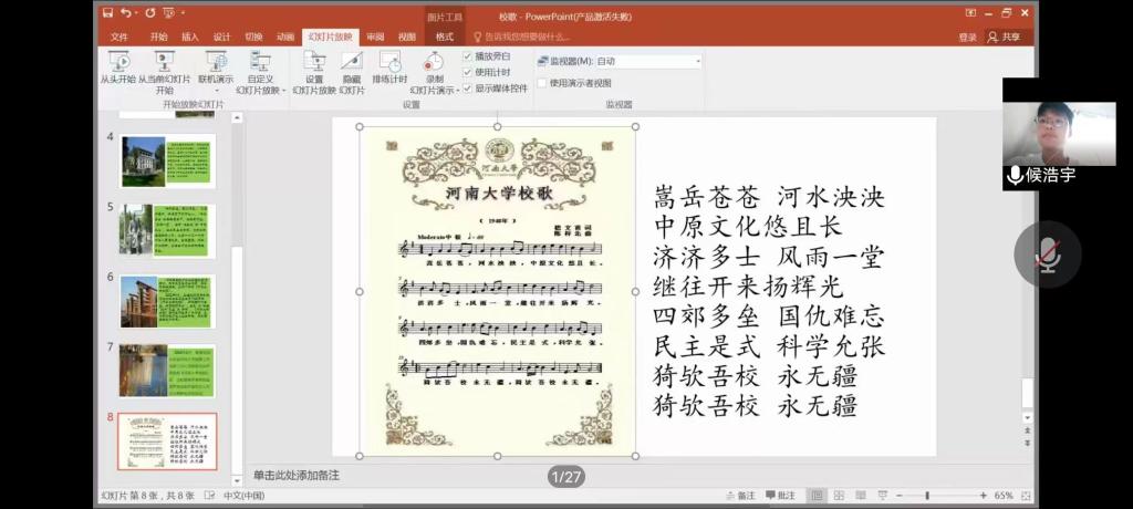校歌的创作背景与创作过程,随后,她带领同学们一起学唱校歌,“嵩岳苍苍,河水泱泱,中原文化悠且长。济济多士,风雨一堂,继往开来扬辉光。四郊多垒,国仇难忘。民主是式,科学允张。猗欤吾校,永无疆。猗欤吾校,永无疆!”那雄浑激昂的旋律,蕴涵着自强不息、百折不挠的河大精神,在欣赏和学唱的过程中,新生同学为之深深感动,沉浸其中。