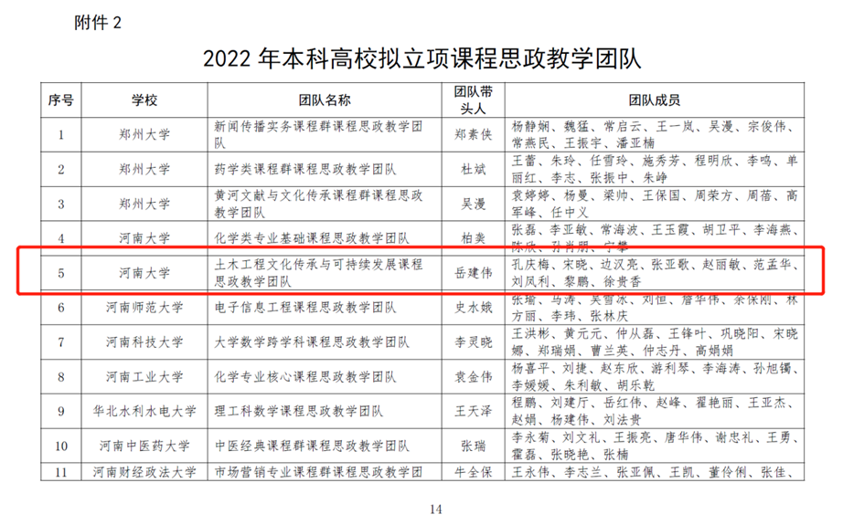 近日,河南省教育厅公布了河南省2022年本科高校课程思政项目评审结果。亚洲情色 岳建伟教授牵头的《土木工程文化传承与可持续发展课程思政教学团队》获批河南省课程思政教学团队,全校仅两个团队获批。