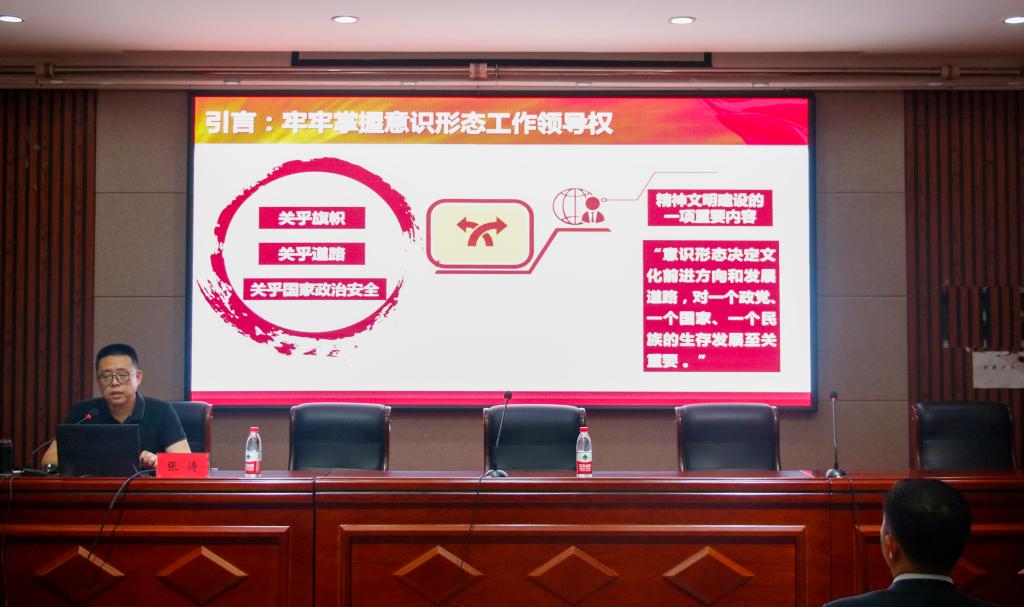 会上,张涛以“‘互联网+’背景下的意识形态工作——挑战和应对”为主题作专题报告。他围绕当前思想与意识形态建设的新形势和思想及意识形态建设新阵地互联网等方面详细解读了意识形态工作的重要性和复杂性,并深刻阐述了做好意识形态工作的方法对策。他指出:“意识形态关乎旗帜、道路、国家政治安全,面对新形势新问题,党员干部要提高政治站位,真正把意识形态工作的责任扛在肩上,把各项工作的落实抓在手上,进一步统一思想、凝聚力量,防范风险、应对挑战,牢牢掌握党对意识形态工作领导权。”