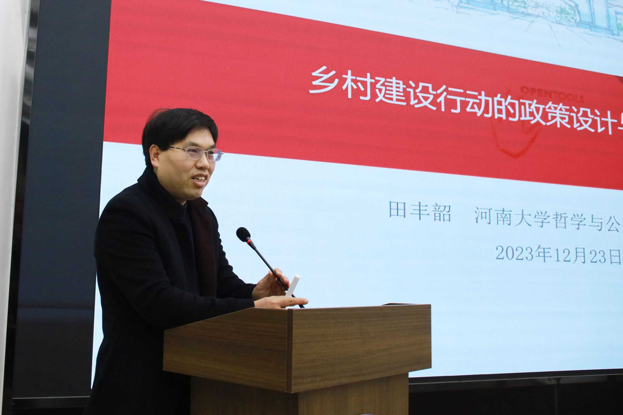 哲学与公共管理学院副院长、硕士生导师,华中科技大学乡村振兴研究院研究员田丰韶副教授基于长期的乡村振兴与乡村发展、社会政策与社会建设等研究内容,做了题为“乡村建设行动的政策设计与未来发展”的报告。