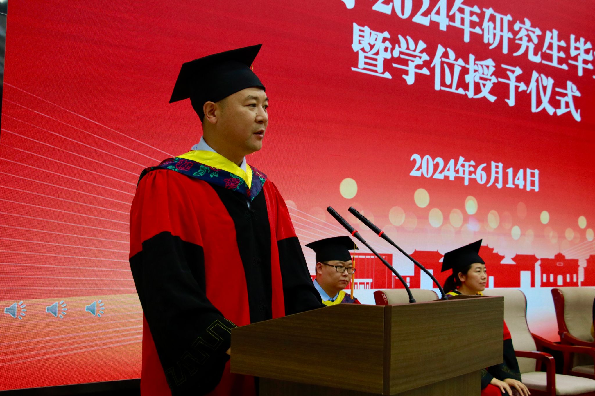 南晗代表学院全体教职员工向毕业生们致以热烈的祝贺。他向大家提出了三点期望:一是胸怀爱国之心,勇担复兴使命,将个人的理想追求融入党和国家事业之中,将自身的成长发展与民族伟大复兴紧密相连,修炼“小我”成就“大我”。二是保持奋斗底色,传承河大精神,秉承“百折不挠、自强不息”的河大精神,弘扬“自信、拼搏、开放、创新”的新河大精神,担负起“铁塔牌”学子的责任和担当。三是增强实践意识,坚持知行合一,以知促行将创新的“思路”变为“出路”,以行求知将创新的“潜能”变为“动能”,在知行合一的创新创造中更好地认识世界、改造世界。他祝愿同学们以梦为马,不负韶华,乘风破浪,书写属于自己的精彩篇章。
