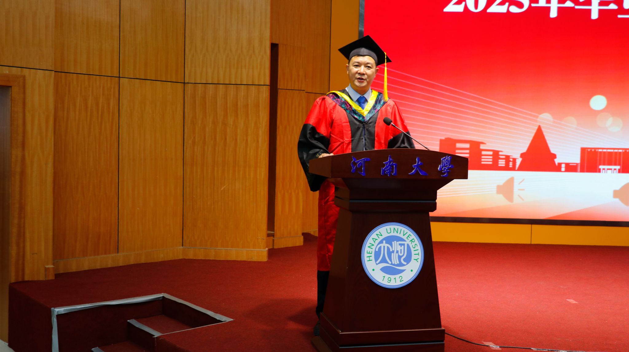 教师代表、2025届研究生辅导员王亚光老师对毕业生提出三点期望:一是要永葆匠心与责任,二是要勇于创新突破,三是要胸怀家国且脚踏实地。他希望同学们牢记“建工人”的骄傲与担当,在祖国大地上,留下属于河大学子的坚实足迹与壮丽标高。