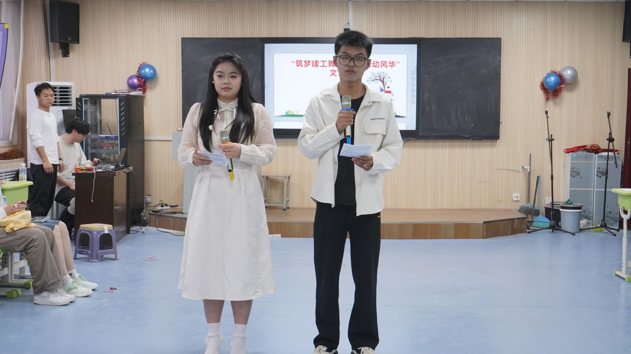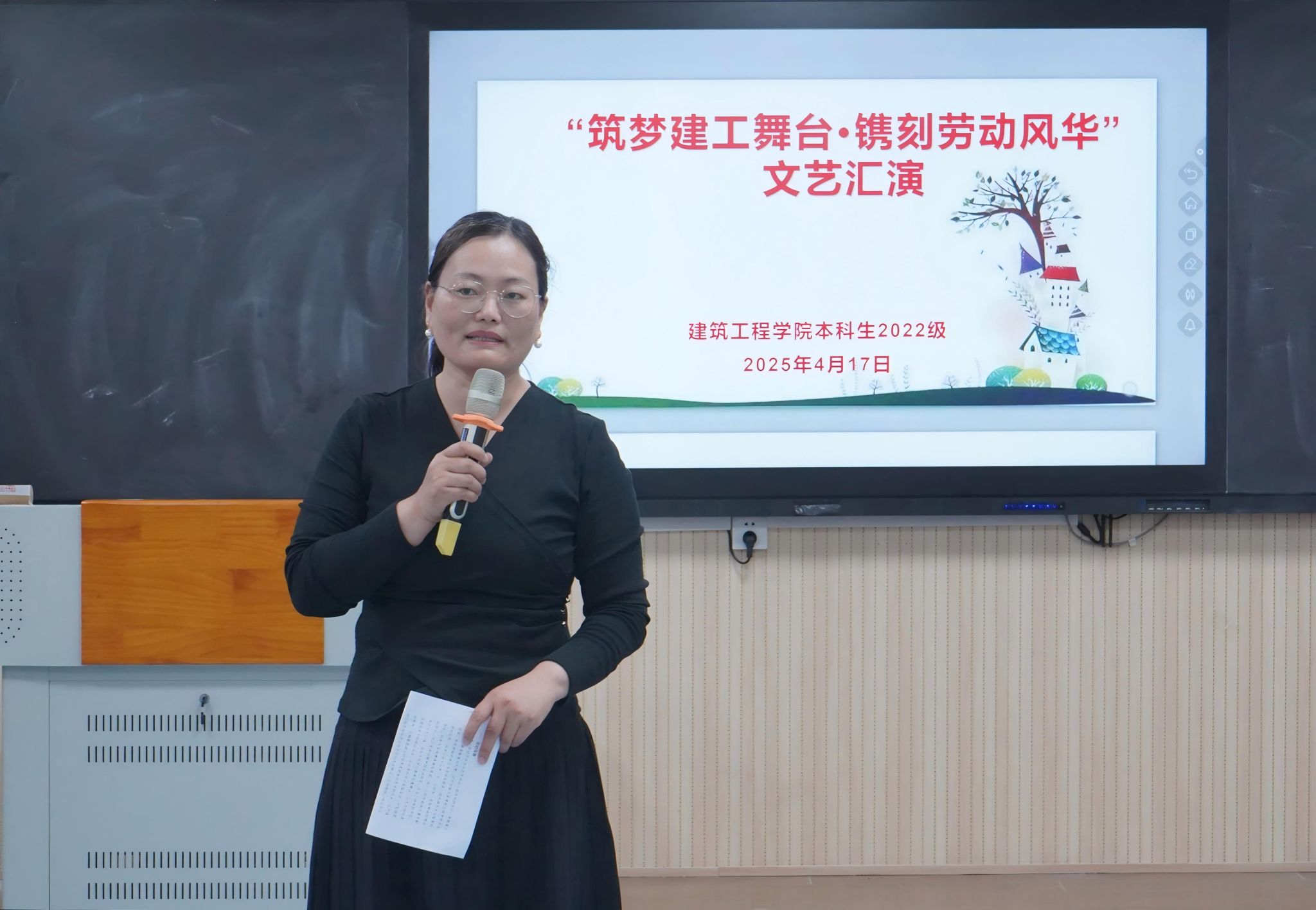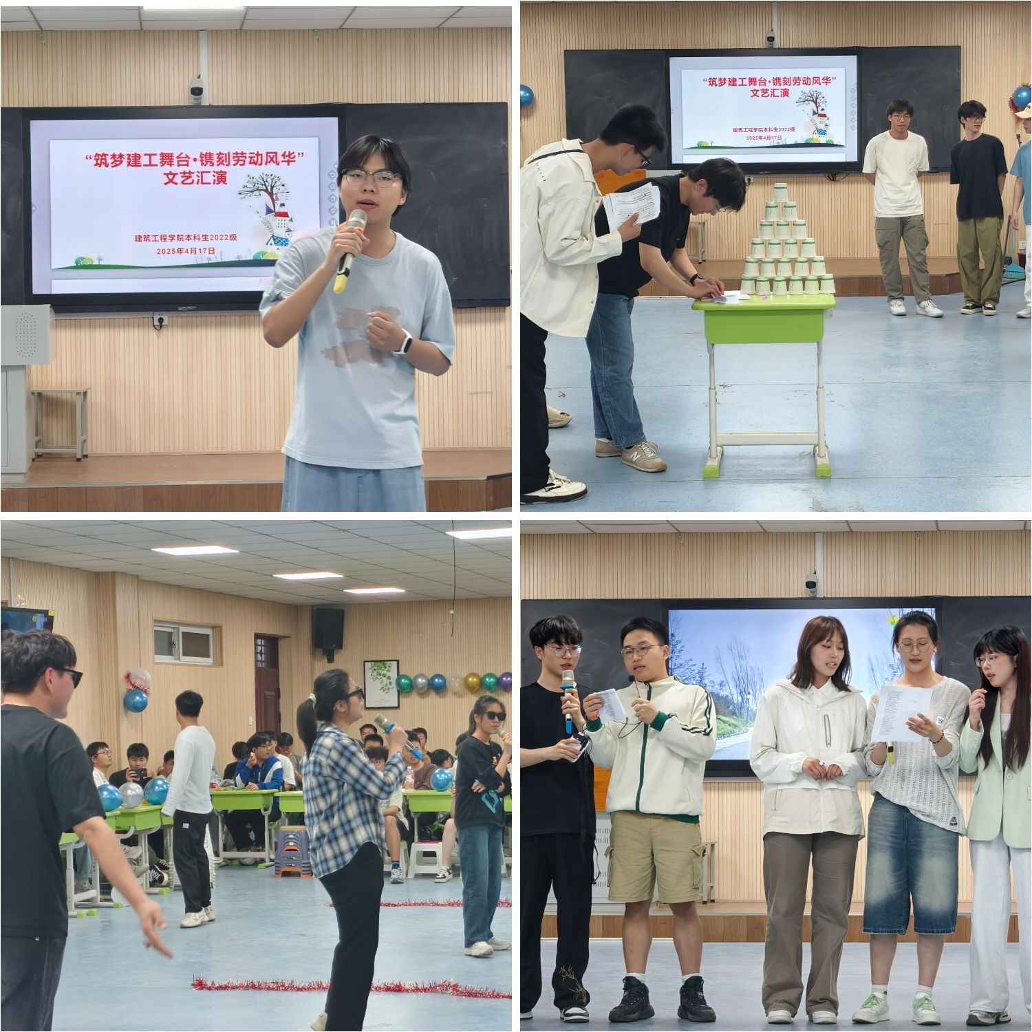 606智慧教室举办了一场别开生面的文艺晚会。晚会以“筑梦建工舞台·镌刻劳动风采”为主题,通过朗诵、歌舞、魔术等多样化的节目形式,展现了建工学子的多才多艺与青春活力。