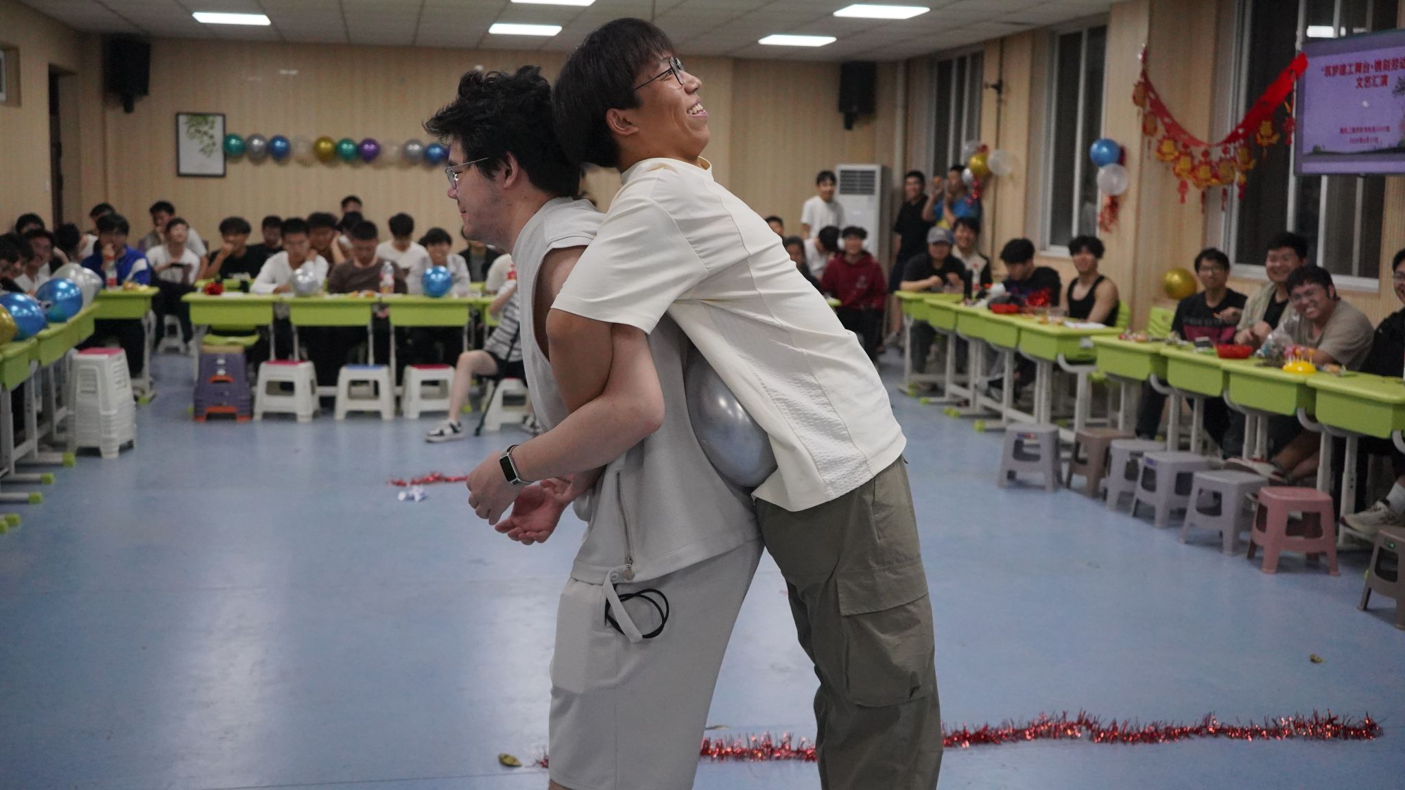 整场晚会共16个节目,由2022级地下班班长董志飞、建筑班团支书董婉婷主持。多元节目轮番登场,创意与情怀交织,涵盖朗诵、音乐、互动游戏等多种形式。开场的朗诵节目《海燕》以铿锵有力的声音致敬经典,瞬间点燃现场氛围。随后的吉他弹唱《红色高跟鞋》与合唱《多远都要在一起》用音符串联起青春记忆,引发全场共鸣。魔术表演《汽水预言》以神秘互动掀起高潮,表演者巧妙的手法令观众惊叹连连。特别环节中,《后妈茶话会配音》以幽默诙谐的台词和生动的演绎赢得阵阵笑声;诗词朗诵《沁园春·长沙》则以豪迈的气势展现了建工学子的家国情怀。此外,《秋天的怀念》等节目通过真挚的情感表达,传递出同窗情谊与对生活的思考。