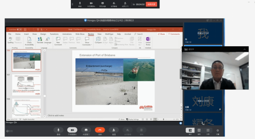 The second lecture was given by Professor Erwin Oh from Griffith University in Australia on May 5 and was conducted live on DingTalk. Vice President Zhang Jianwei hosted the discussion. Dr. Hongyu Qin and Dr. Hao Wang participated in the discussion online. This course mainly applies the principles of soil mechanics to solve basic engineering problems in actual engineering, especially the analysis and calculation methods in the process of basic engineering design. It mainly includes: site investigation and in-situ test; analysis of bearing capacity and settlement of shallow foundation; analysis and design of pile foundation under vertical load and horizontal load, etc.