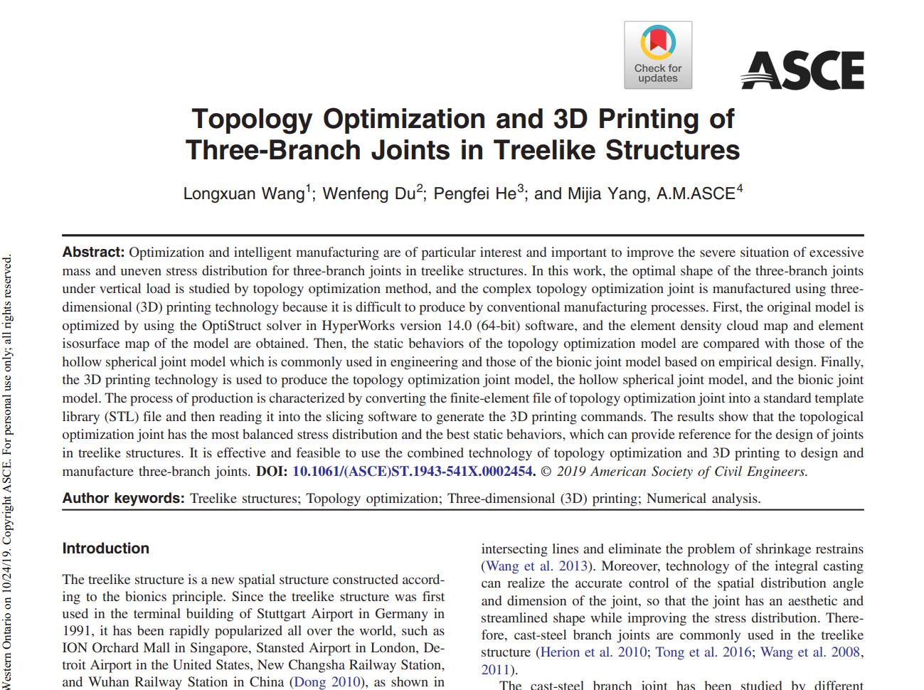 2019年10月23日, 2017级土木工程专业硕士研究生王龙轩同学作为第一作者在美国土木工程学会(ASCE)旗下的SCI期刊“Journal of Structural Engineering”(中科院2区)上在线发表题为“Topology Optimization and 3D Printing of Three-Branch Joints in Treelike Structures”的论文。该论文的通讯作者是导师杜文风校特聘教授。