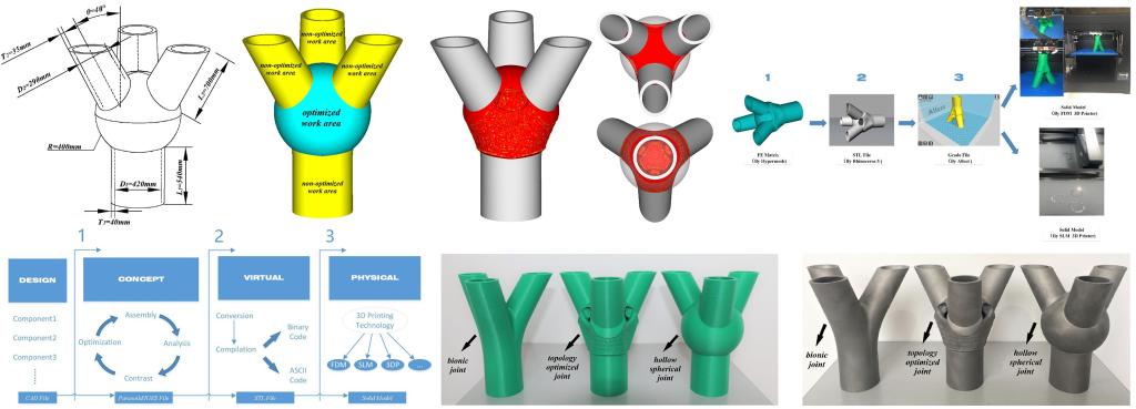 本项研究针对大跨度树状仿生结构中的铸钢分叉节点在设计及制造过程中存在的优化不足、应力集中现象明显,自重明显偏大大,生产成本高且效率低下等技术难题,采用拓扑优化(Topology Optimization)的方法对铸钢分叉节点的最优拓扑形态进行了研究,并利用3D打印制造技术探寻了铸钢分叉节点智能制造方式。该研究成功实现了基于拓扑优化和3D打印一体化的节点智能制造技术,减少了节点自重,提升了节点的优化水平,降低了能源消耗,提高了工程效率。