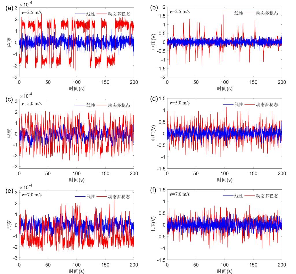 线性和动态多稳态系统的应变(左列)和电压(右列)响应