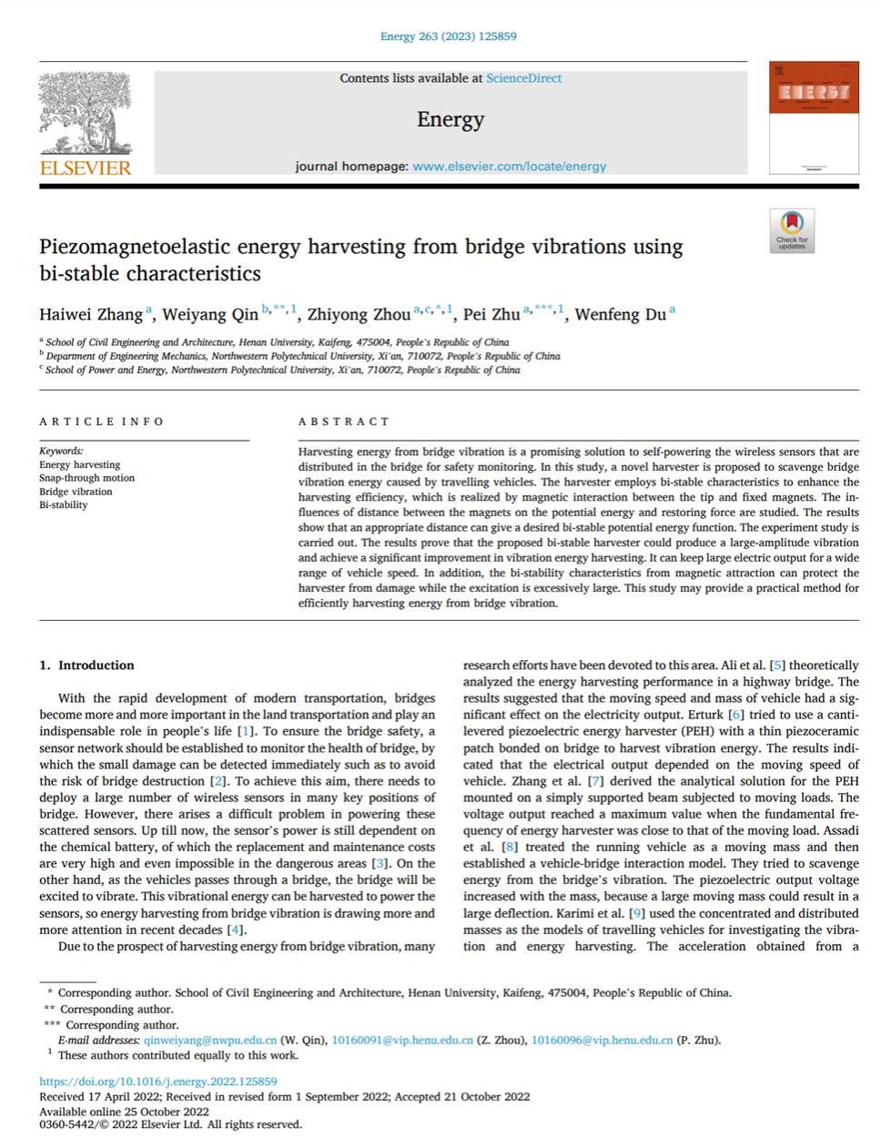 钢与空间结构研究所周志勇课题组在国际能源类知名期刊《Energy》(中科院JCR一区期刊,影响因子9)期刊上发表题为“Piezomagnetoelastic energy harvesting from bridge vibrations using bi-stable characteristics”的研究论文。该研究成果是亚洲情色