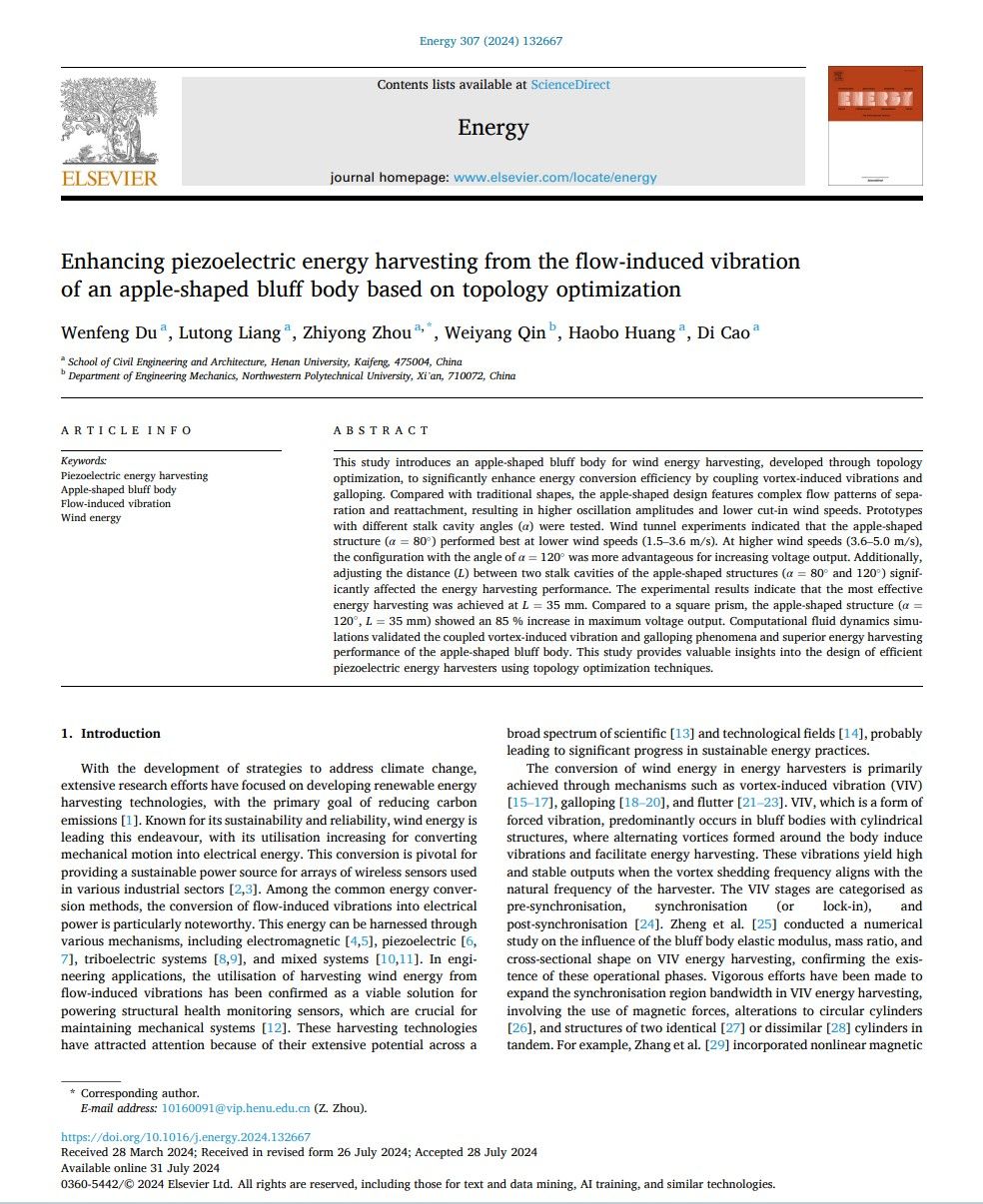 钢与空间结构研究所杜文风课题组在国际能源类知名期刊《Energy》(中科院JCR一区期刊,影响因子9)期刊上发表题为“Enhancing piezoelectric energy harvesting from the