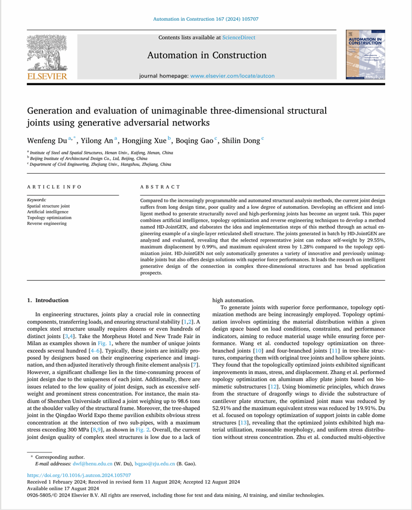 钢与空间结构研究所杜文风课题组在国际土木工程领域知名期刊《Automation In Construction》(中科院JCR一区top期刊,影响因子9.6)期刊上发表题为“Generation and Evaluation of Unimaginable Three-Dimensional Structural Joints Using Generative Adversarial Networks”的研究论文。该研究成果是建筑工程亚洲情色
