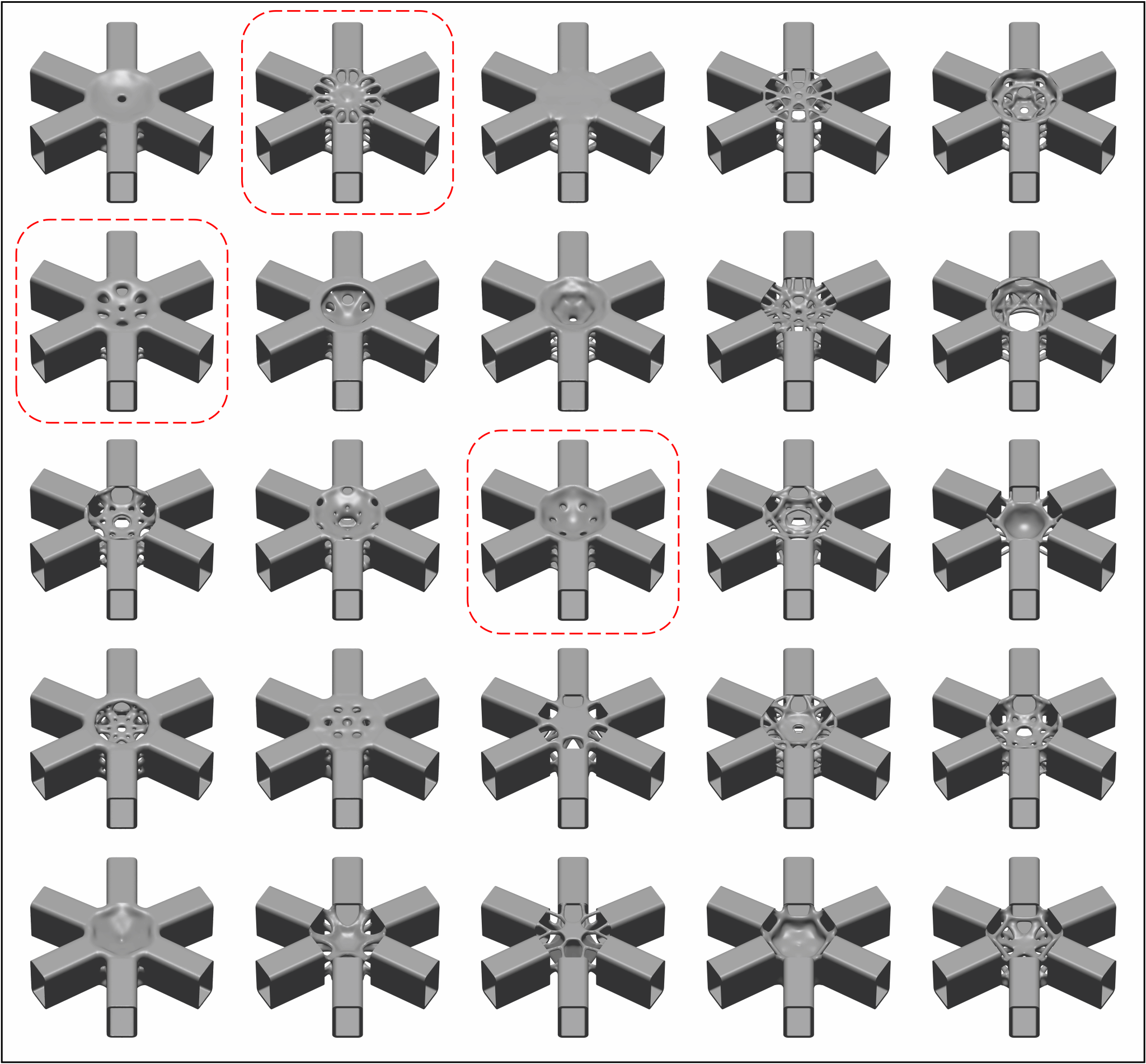 与日益可编程和自动化的结构分析方法相比,当前的节点设计存在设计时间长、质量差和自动化程度低的问题。开发一种高效、智能的方法来生成结构新颖且性能优异的节点已成为一项紧迫任务。本文结合人工智能、拓扑优化和逆向工程技术,开发了一种名为 HD-JointGEN 的方法,并通过一个单层网壳结构的实际工程实例阐述了该方法的思路和实现步骤。对 HD-JointGEN 批量生成的节点进行分析和评估,结果表明,与拓扑优化节点相比,所选的代表性节点可减少 29.55% 的自重、0.99% 的最大位移和 1.28% 的最大等效应力。HD-JointGEN 不仅能自动生成各种创新且以前难以想象的节点,还能提供具有卓越力学性能的设计解决方案。它引领了复杂三维结构中连接件的智能生成设计研究,具有广阔的应用前景。
