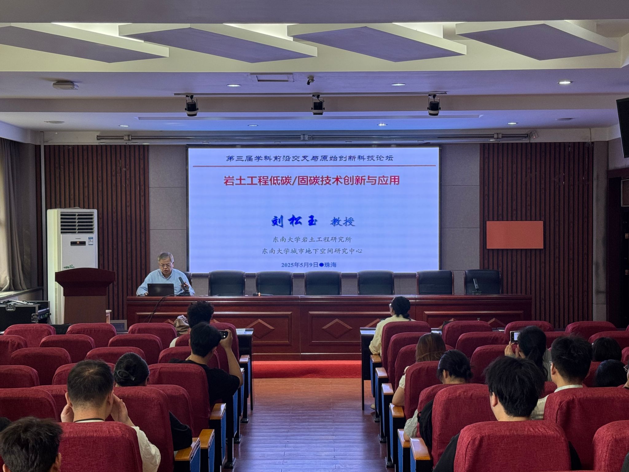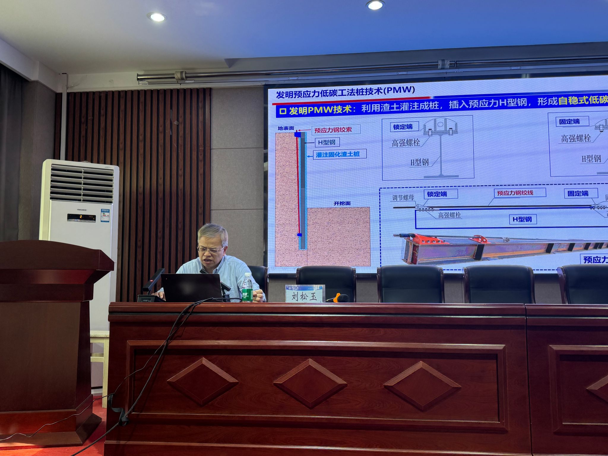刘松玉教授以国家“双碳战略为背景,详细介绍了团队在低碳、固碳地基领域研发的气动地基处理技术、变截面双向搅拌桩技术、碳化固化地基技术等创新成果,讲述了固碳轻质土的原理与方法;并结合科技创新主流范式,详细阐述岩土工程行业的几大创新途径,勉励在读学生要为国家的高质量发展贡献智慧。讨论环节,师生围绕变截面桩中变截面的实现方式等问题,与刘松玉教授展开深入交流。