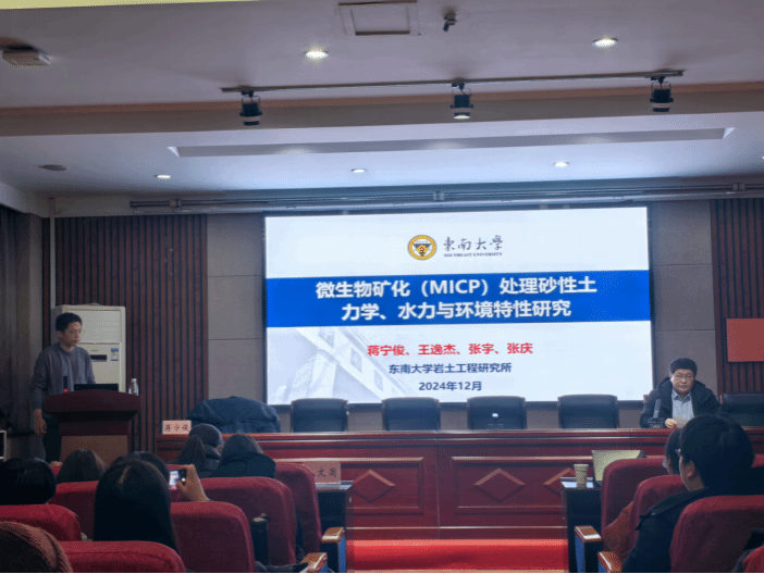 蒋老师从微生物矿化研究背景,微生物矿化研究前景与关键问题,应用案例,MICP加固机理和行为特征等几个方面,分享了自己在微生物矿化技术中的科研经历和内心感触;介绍了其团队在MICP方面的研究和最新进展,并结合实例详细讲述了如何准确提炼关键科学问题。报告结束后,现场师生就相关问题展开了热烈讨论。