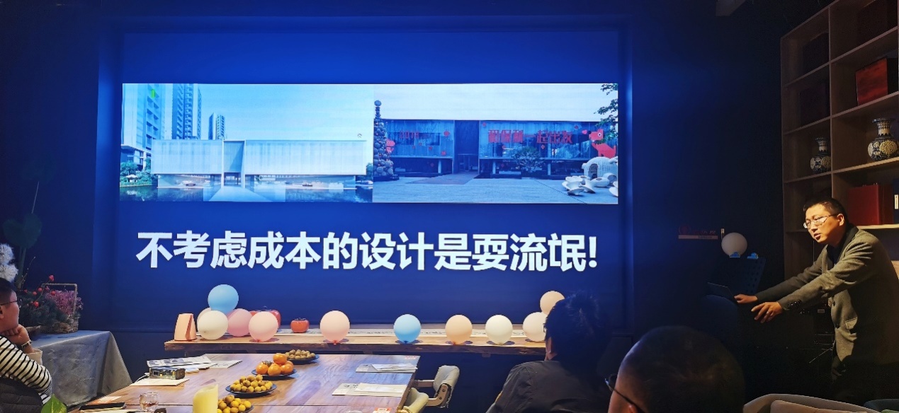 02级建筑学的朱亮先生,现任尤安设计公司四部设计总监,拥有多年的高端居住建筑及相关售楼处、街区商业建筑设计经验。在后疫情时代,开发商越来越重视成本的情况下,如何能在极限成本控制下创造出相对高品质的作品成了设计师们孜孜不倦的追求。朱亮从“密、文、构、限、收、混、嵌、异、精、学”等几个方面,讲述了如何通过对体块、沟边、分缝嵌条、交接、阳角等精细化的设计处理,色彩、比例、构图的精准把控,结合差异化的混搭设计,在极限成本控制下创造出高品质的设计作品。他从一个全新的角度,对建筑设计与实践的结合做了完美的诠释。